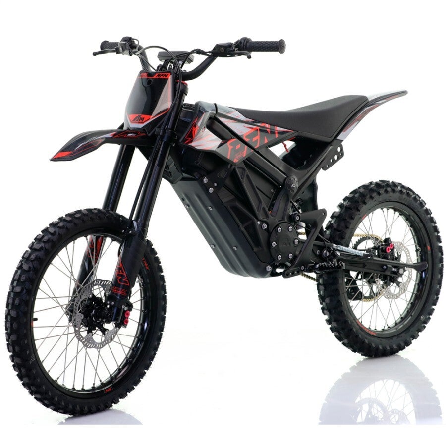 Moto electrica off road 5000W, batería de litio extraíble de 74V 35Ah. Llantas 19/18" pulgadas con frenos y suspensión hidráulico. Autonomía hasta 140 km aproximadamente y velocidad máxima hasta 80 km en 4 modos de velocidad.